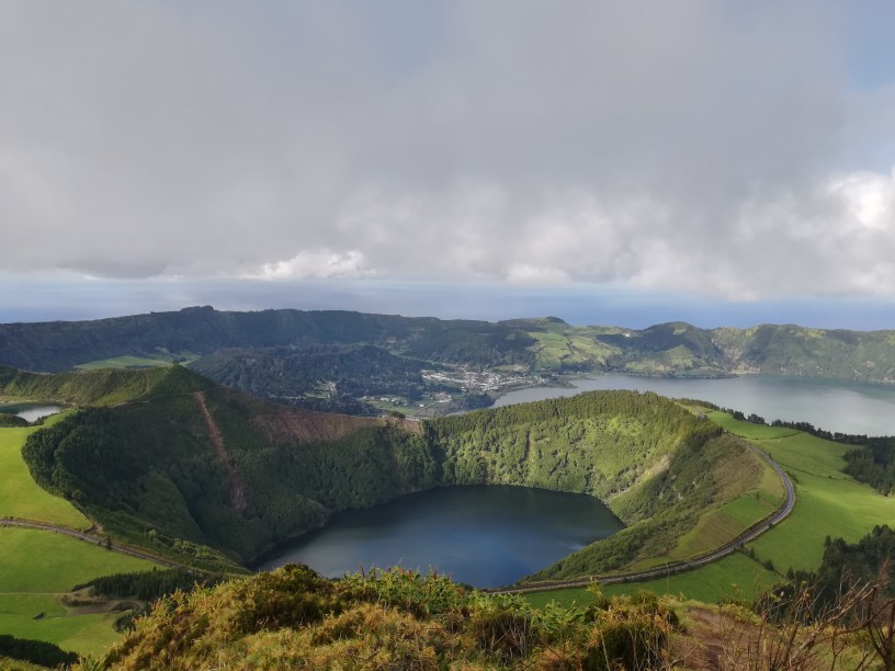 Lá de cima dá pra ver as quatro lagoas, o mar e a vila de Sete Cidades, lá embaixo, no fundo da cratera.