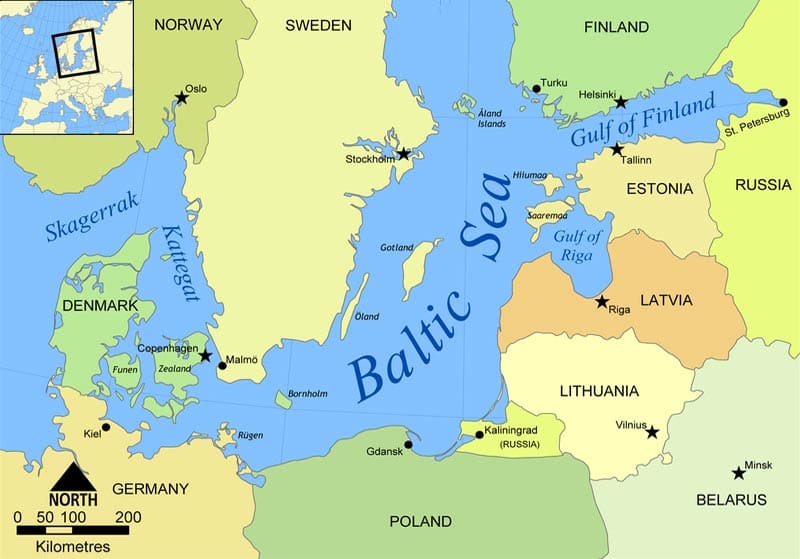 Nesse post a gente vai falar do Mar Báltico, que fica no norte da Europa e é cercado por 9 países: Alemanha, Dinamarca, Noruega, Finlândia, Rússia, Estônia, Letônia e Lituânia.