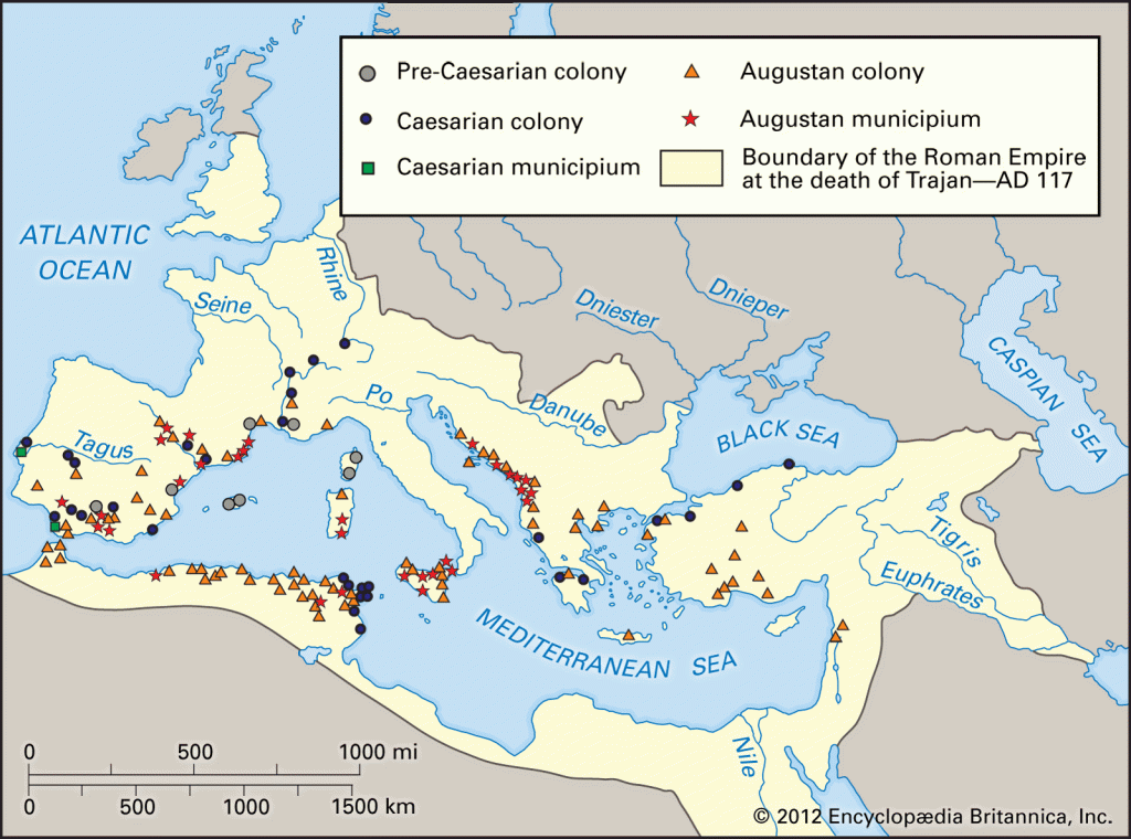The extent of the Roman Empire in 117 CE. Fonte: Encyclopædia Britannica, Inc.