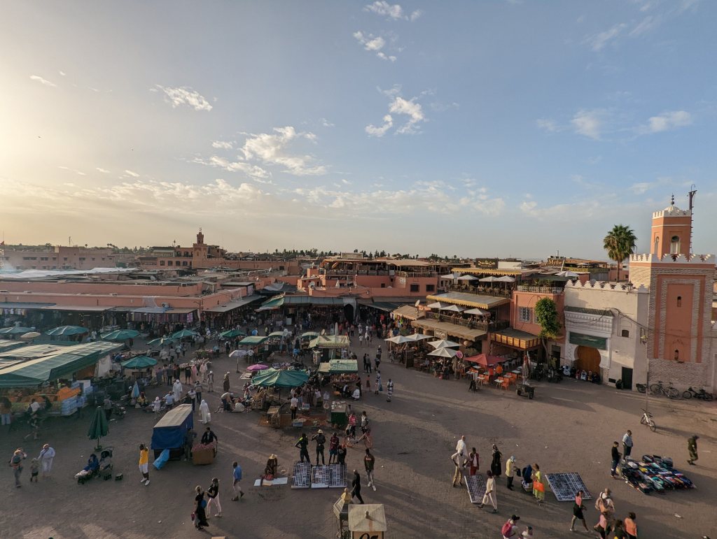 Embora a praça seja uma parada obrigatória em Marrakech (ela é considerada única no mundo), confesso que eu me senti mais confortável olhando a praça de cima.