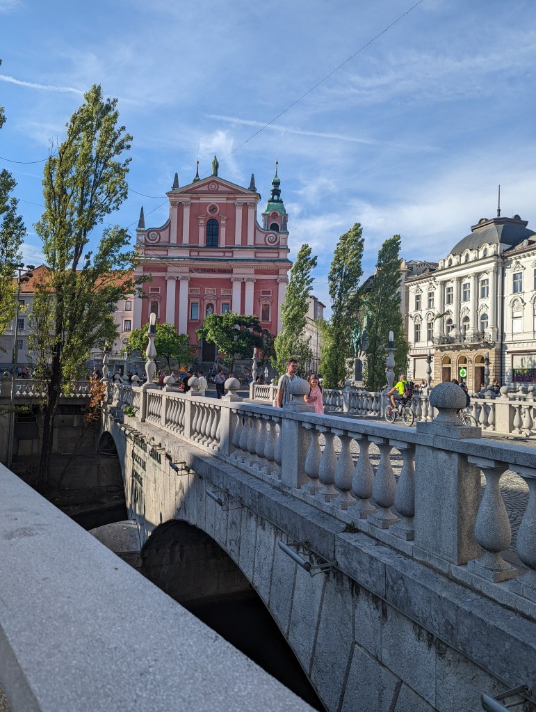 No nosso caminho da Ponte do Dragão (Zmajski most) até a Ponte de Santiago (Šentjakobski most), vamos passar por outras quatro pontes: Mesarski most (ponte dos Açougueiros), Tromostovje (ponte Tripla), Ribja brv (Ponte do Peixe) e Šuštarski most (ponte do Sapateiro).