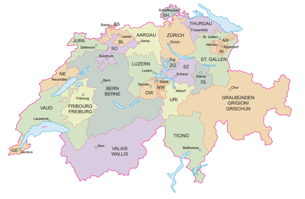A Suíça é uma confederação formada por 26 estados, chamados de cantões (termo medieval que significa “lugar”).