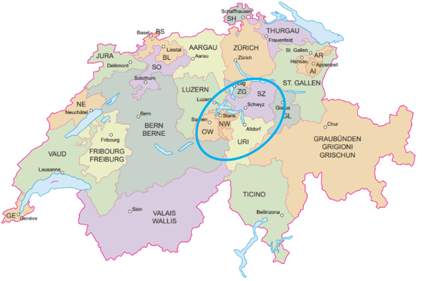 Os cantões que se uniram no final do século XIII foram Ury, Schwiz e Unterwalden, que destaquei com o círculo azul.